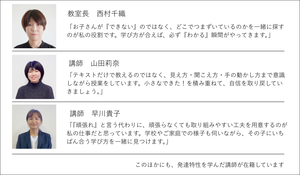 専門家の知見を活かしながらお子さん一人ひとりの特性を踏まえ、その子に合った学び方で指導しています。